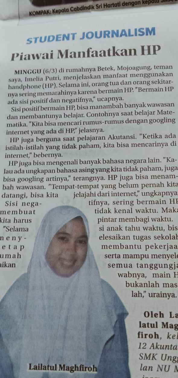 Minggu (6/3) di rumahnya Betek, Mojoagung, teman saya, Imelia Putri, menjelaskan manfaat menggunakan handphone (HP). Selama ini, orang tua dan orang sekitarnya sering memarahinya karena bermain HP. ’’Bermain HP ada sisi positif dan negatifnya,’’ ucapnya.